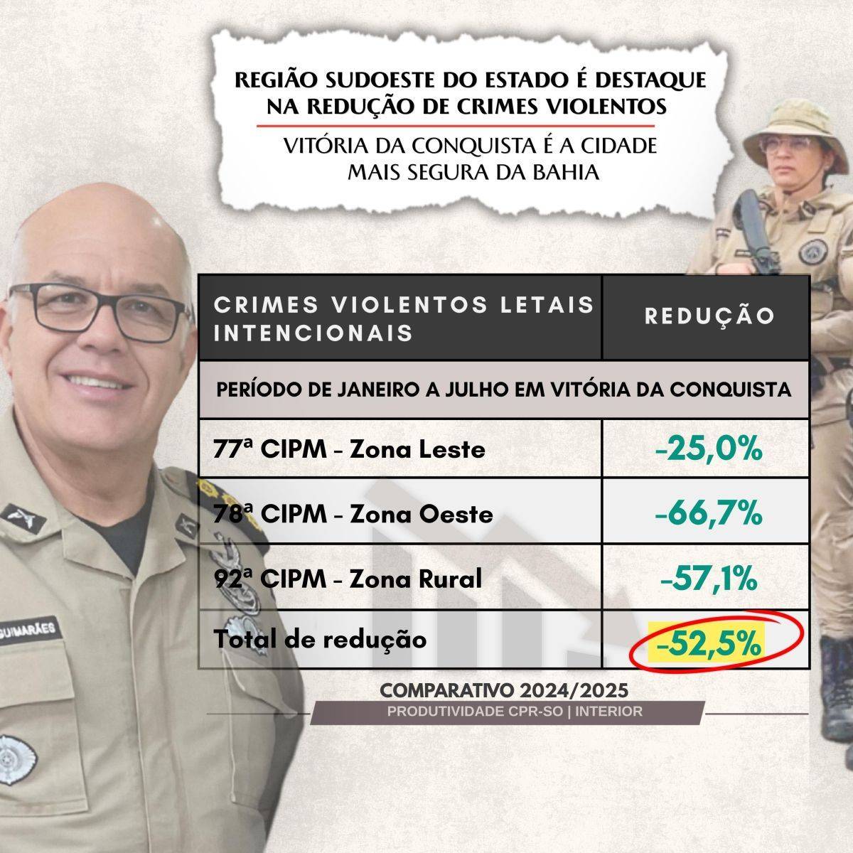 A Polícia Militar da Bahia, por meio do Comando de Policiamento da Região Sudoeste (CPR-SO), tem se destacado na redução da criminalidade graças ao trabalho incansável de seus policiais militares. Vitória da Conquista é a cidade mais segura da Bahia entre os municípios com mais de 100 mil habitantes, os Crimes Violentos Letais Intencionais caíram 52,5% entre janeiro e julho de 2025. Destaque para as áreas da 77ª CIPM (-25%), 78ª CIPM (-66,7%) e 92ª CIPM (-57,1%). Outros municípios também apresentaram importantes reduções, como Ibirataia (-87,5%), Dário Meira (-66,7%), Gongogi (-63,2%) e Palmas de Monte Alto (-50%). Jaguaquara, por sua vez, reduziu em 42,9% os homicídios, resultado da atuação integrada com a Polícia Civil, Ministério Público e FICCO.