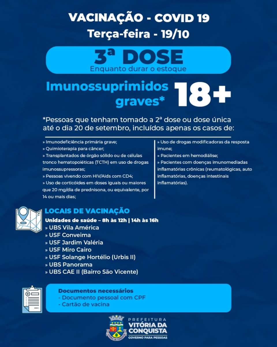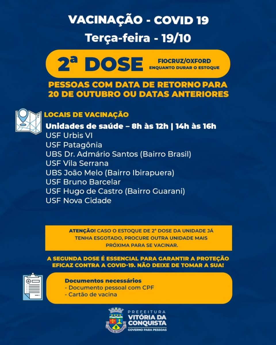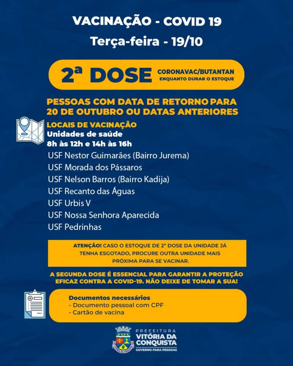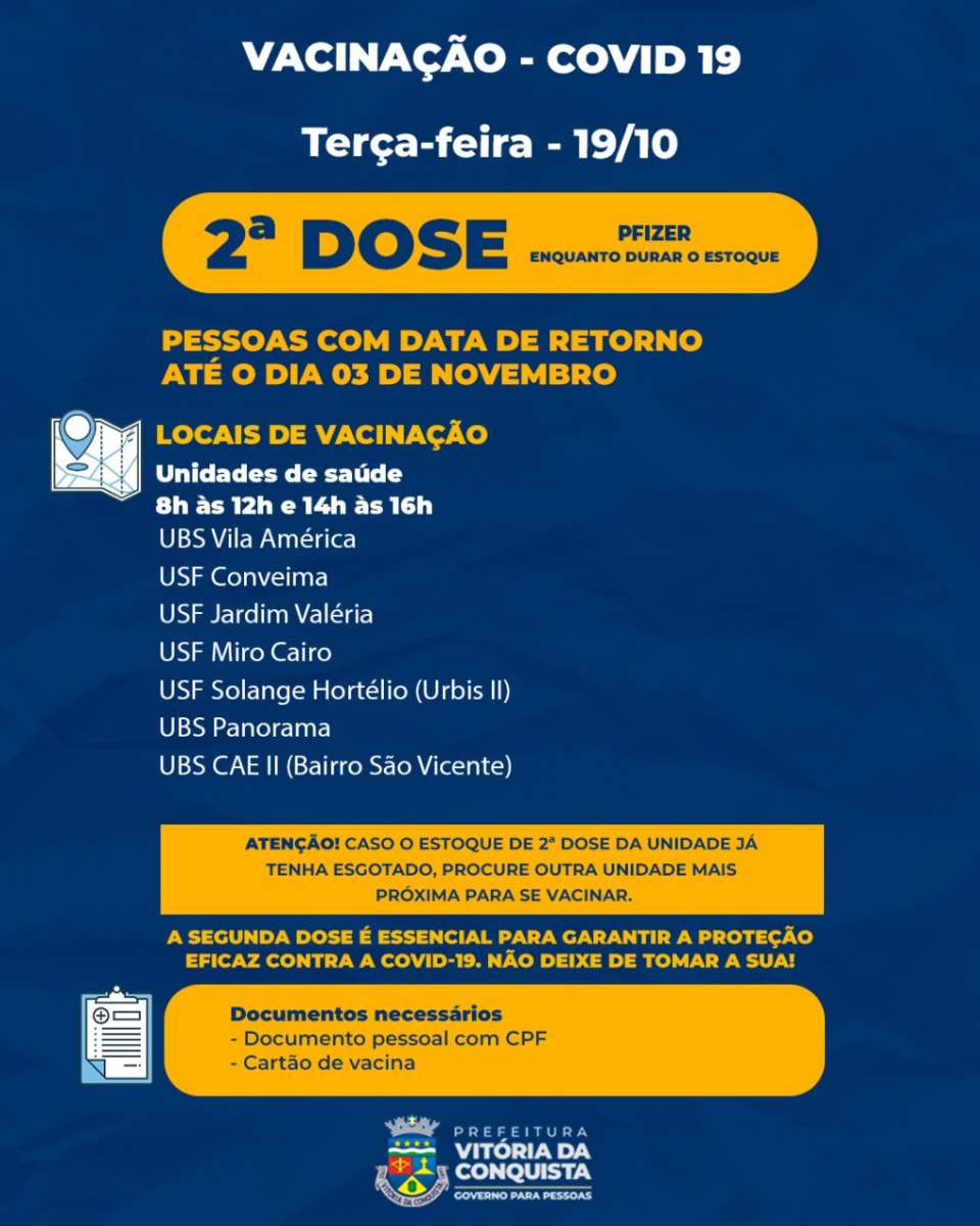 Nesta terça-feira a SMS continua a vacinação com 2ª e 3ª doses, em 22 unidades de saúde da sede do município, por tipo de fabricante de cada vacina, a fim de evitar misturas ou erros de imunização. A vacinação vai de 8h às 12h e de 14h às 16h.