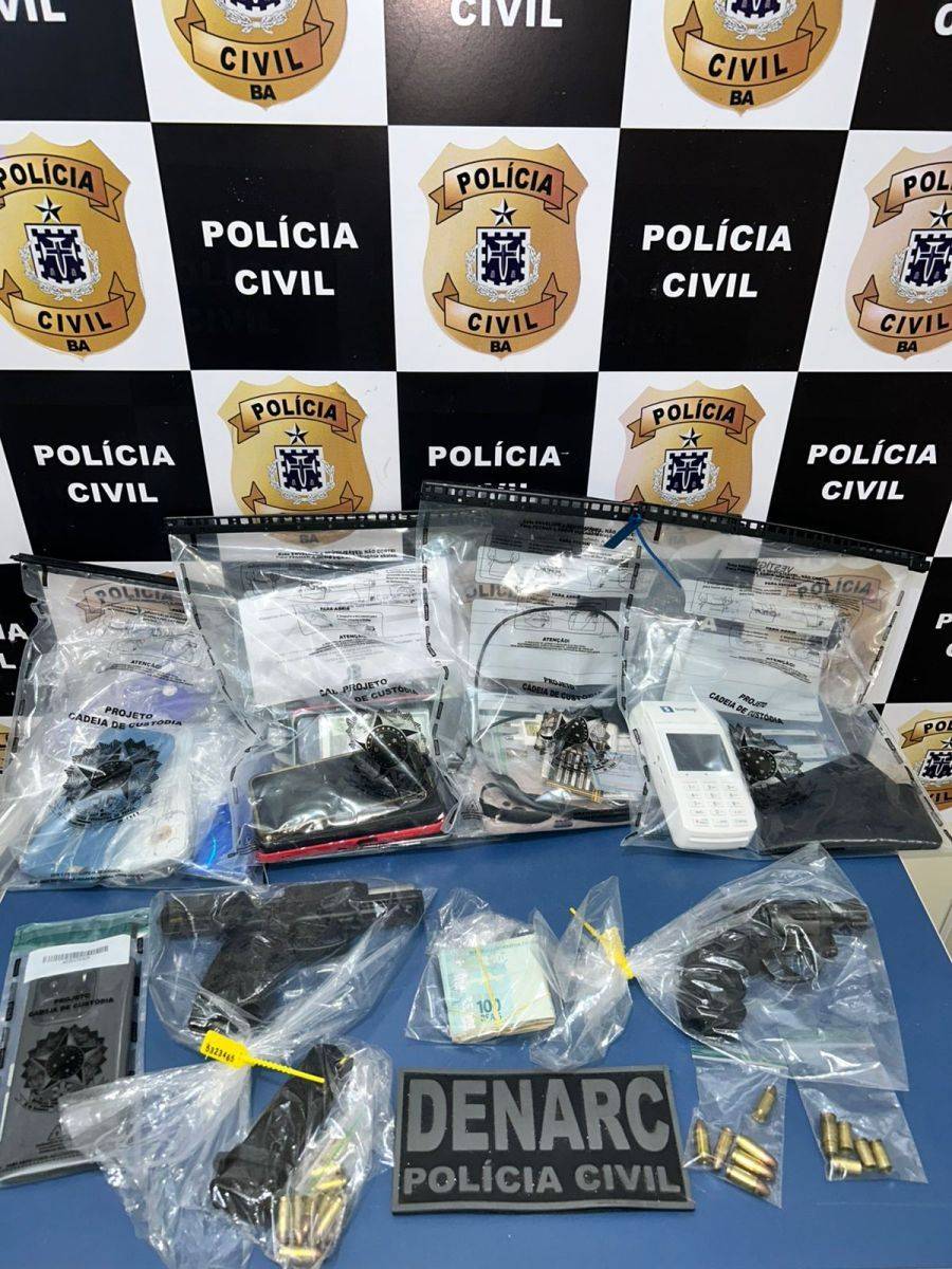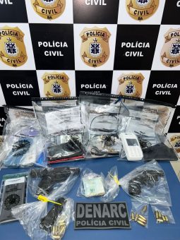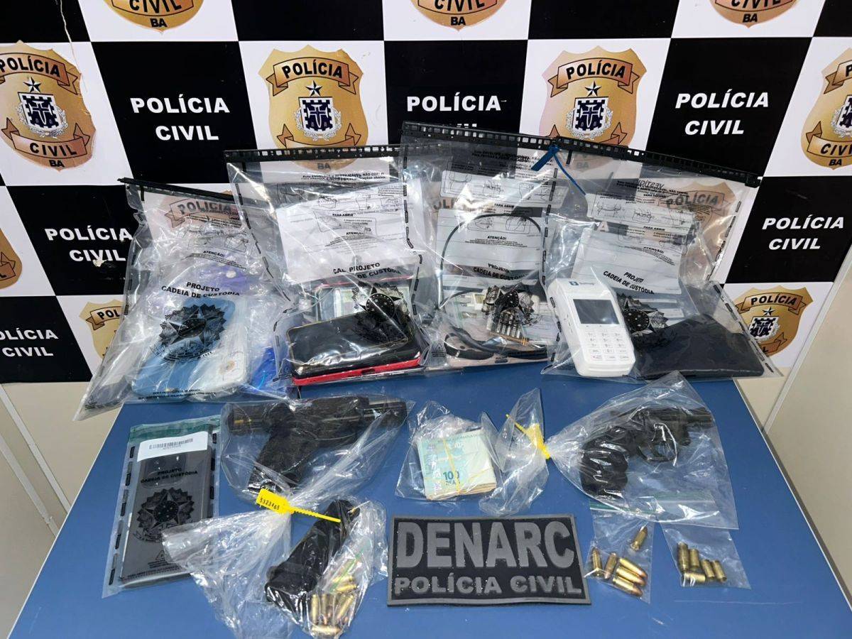 Durante a operação policial, os investigadores apreenderam duas armas de fogo ilegais, sendo uma pistola, calibre 09mm, municiada, e um revólver, calibre 38, além de várias munições, dinheiro da atividade ilícita, e diversos celulares que serão periciados, sendo um homem preso em flagrante delito e outros dois conduzidos para interrogatório.