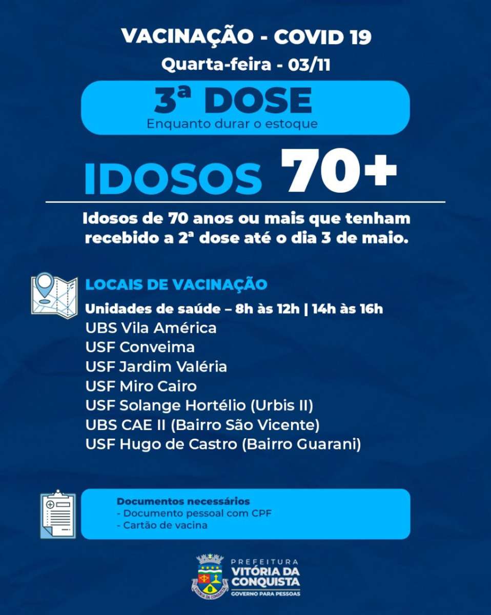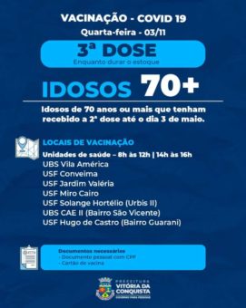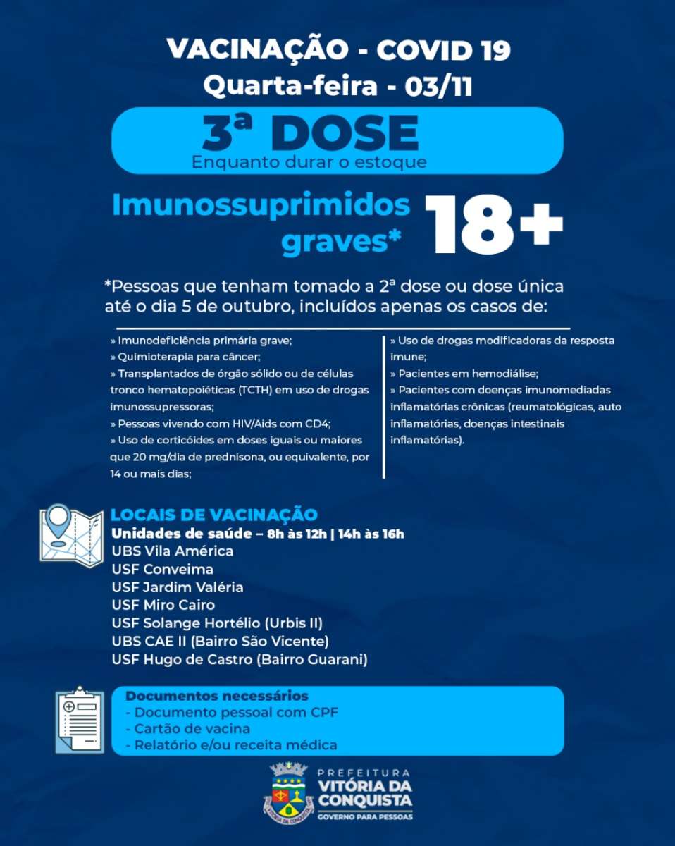 E a 3ª dose estará disponível para idosos com 70 anos ou mais, que tenham recebido a 2ª dose até o dia 13 de maio; e para pessoas imunossuprimidas graves, com 18 anos ou mais, que tenham tomado a 2ª dose ou dose única até o dia 5 de outubro. A vacinação acontecerá enquanto durarem os estoques.