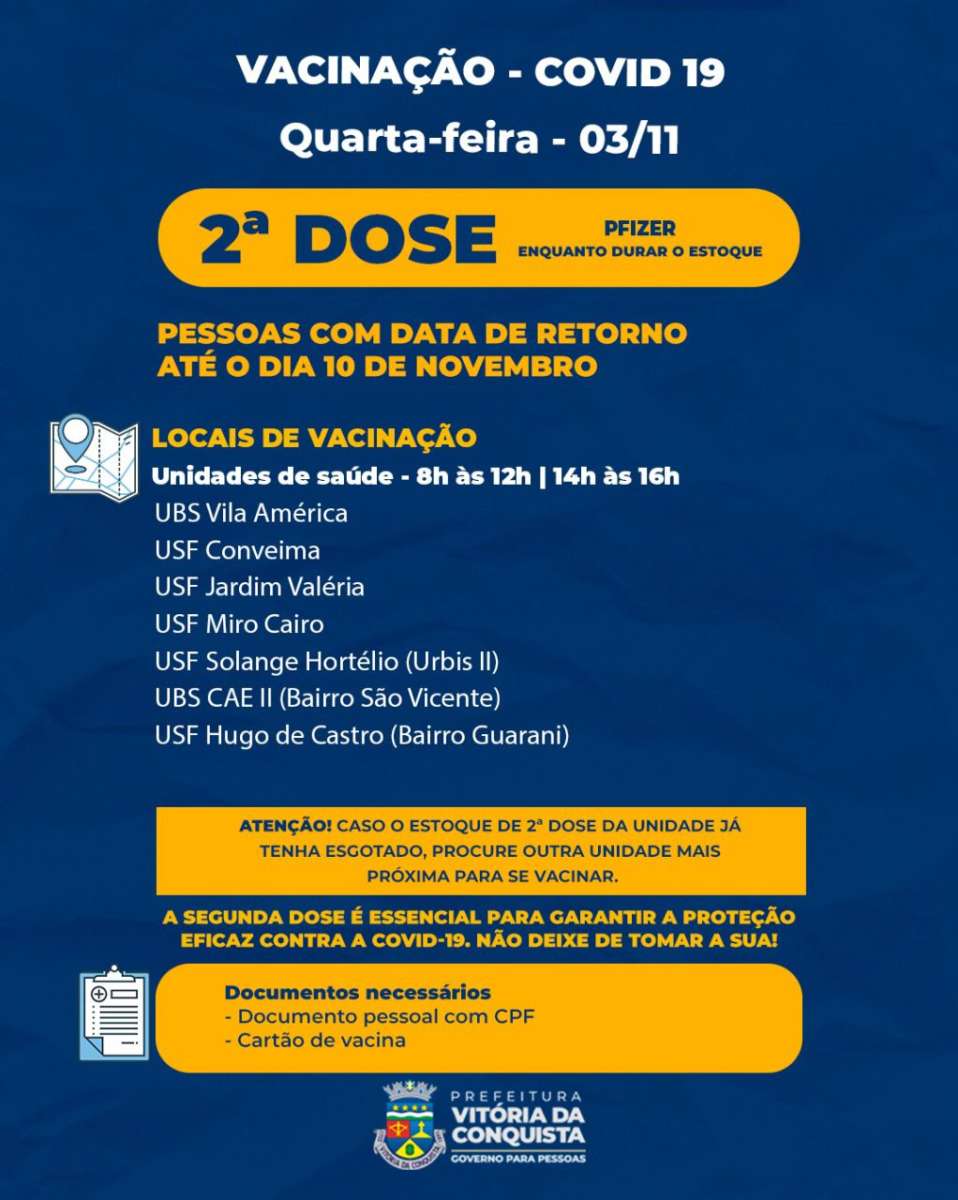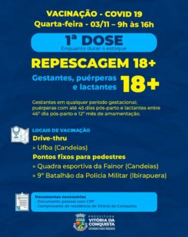 Nesta quarta-feira (3), acontecerá a vacinação de 1ª, 2ª e 3º dose contra a Covid-19. Gestantes, puérperas e lactantes com 18 anos ou mais que ainda não se vacinaram podem se dirigir à quadra esportiva da Fainor, ao 9º Batalhão da Polícia Militar ou ao drive-thru da Ufba, das 9h às 16h, para receber a primeira dose do imunizante.