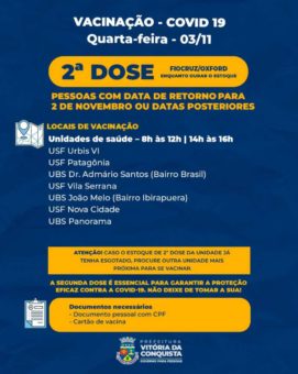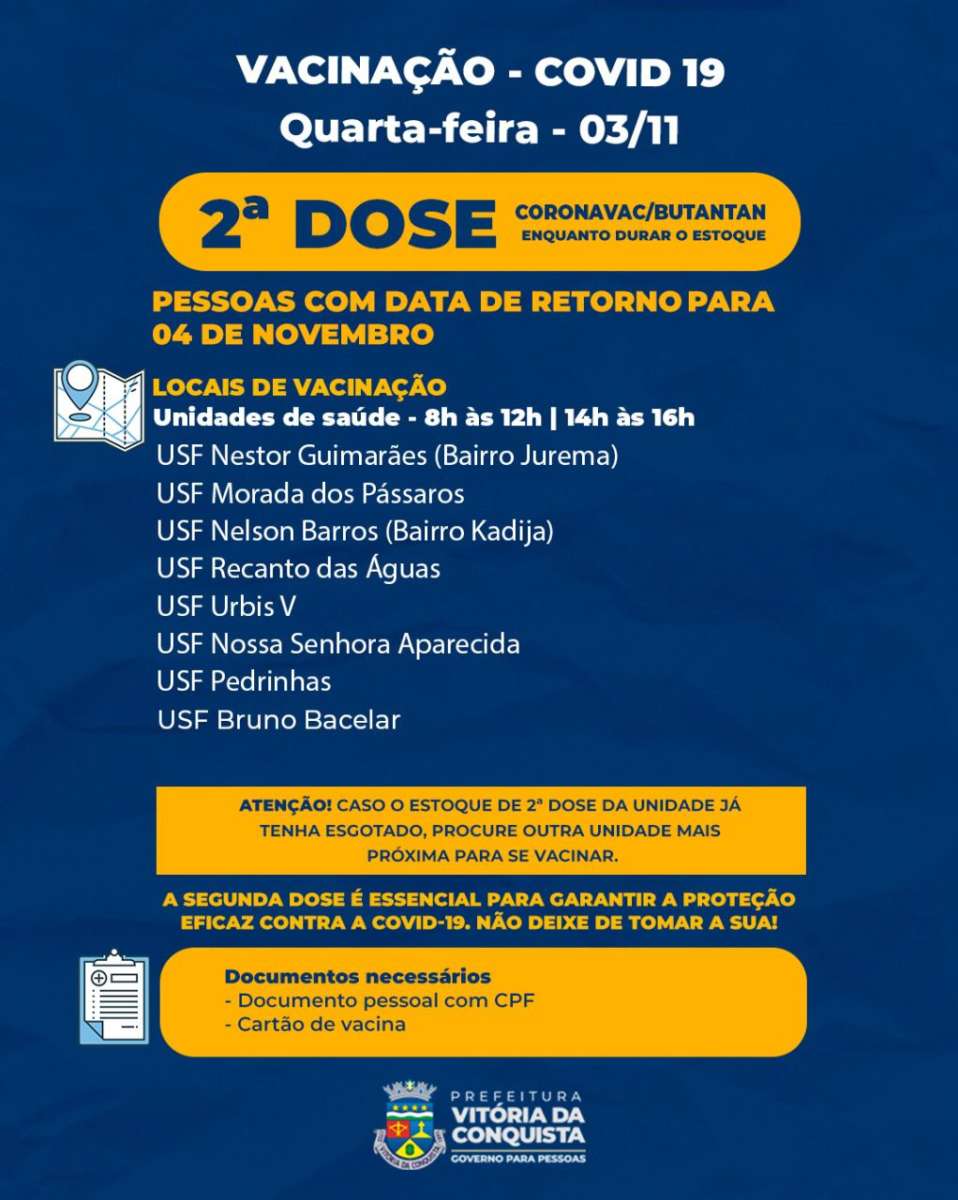 Poderão se vacinar com a 2ª dose pessoas com retorno para 2 de novembro ou datas posteriores, no caso da Fiocruz/Oxford; com retorno até 10 de novembro, para a Pfizer; e retorno em 4 de novembro, para quem se vacinou com a Coronavac/Butantam.